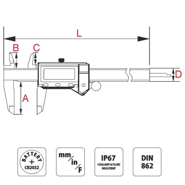 Digitaler Messschieber mit großem, gut ablesbarem Display. Unempfindlich gegen Staub, Wasser und Öl.