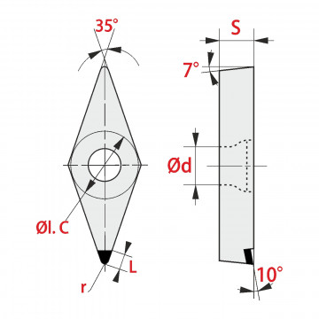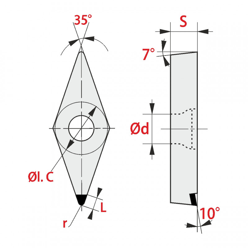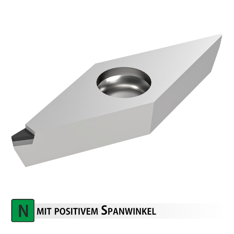 ACHTUNG! Bei Aluminium mit einem niedrigen Siliziumgehalt sowie weichen Materialien mit langer Spanbildung, benötigen Sie die VCGT-Wendeschneidplatte mit positivem Spanwinkel.