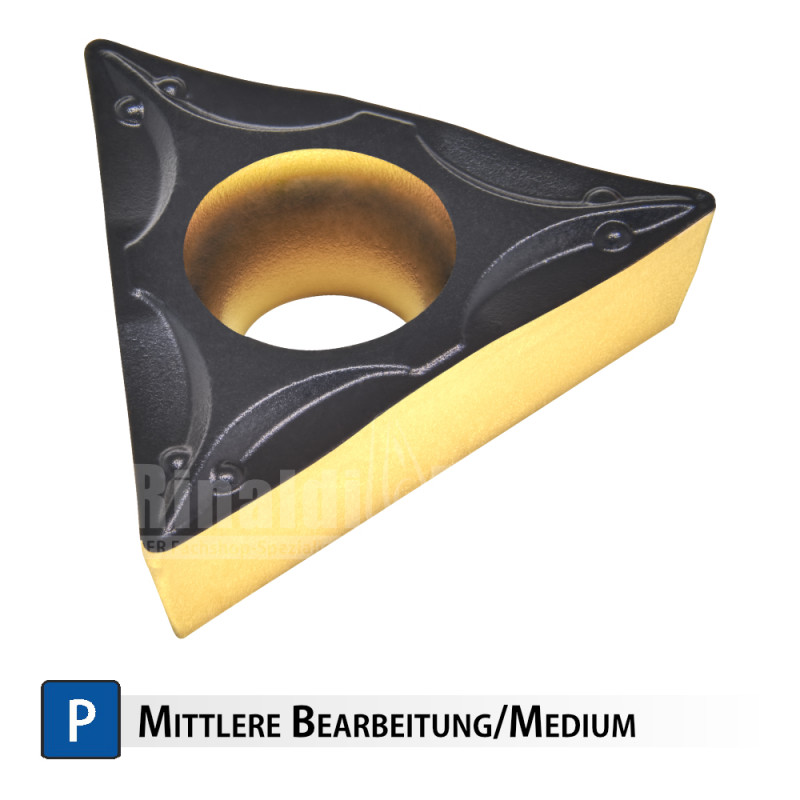 TCMT 16T308-PM-RT250+ 1771613 16,5 9,525 3,97 4,4 0,8 Stahl, mittlere Bearbeitung Vc=120-250m/min f=0,05-0,18 mm/U